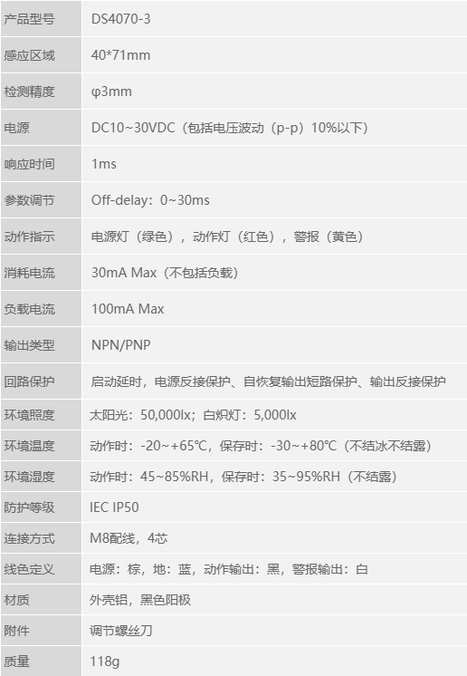 | 線色定義 | 電源:棕,地:藍,動作輸出:黑,警報輸出:白 |